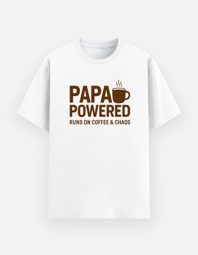 The “PAPA POWERED – Runs on Coffee & Chaos” tee is a fun, relatable nod to real-life fatherhood — equal parts love, laughter, and late-night energy.